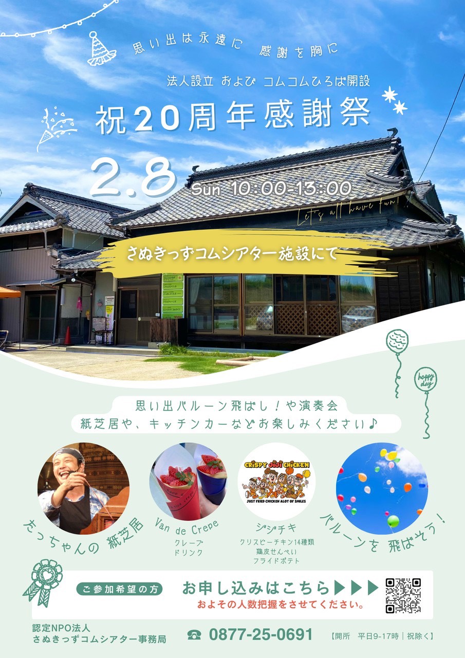 さぬきっずコムシアターは、おかげさまで法人設立および「コムコムひろば」開設20周年を迎えました。